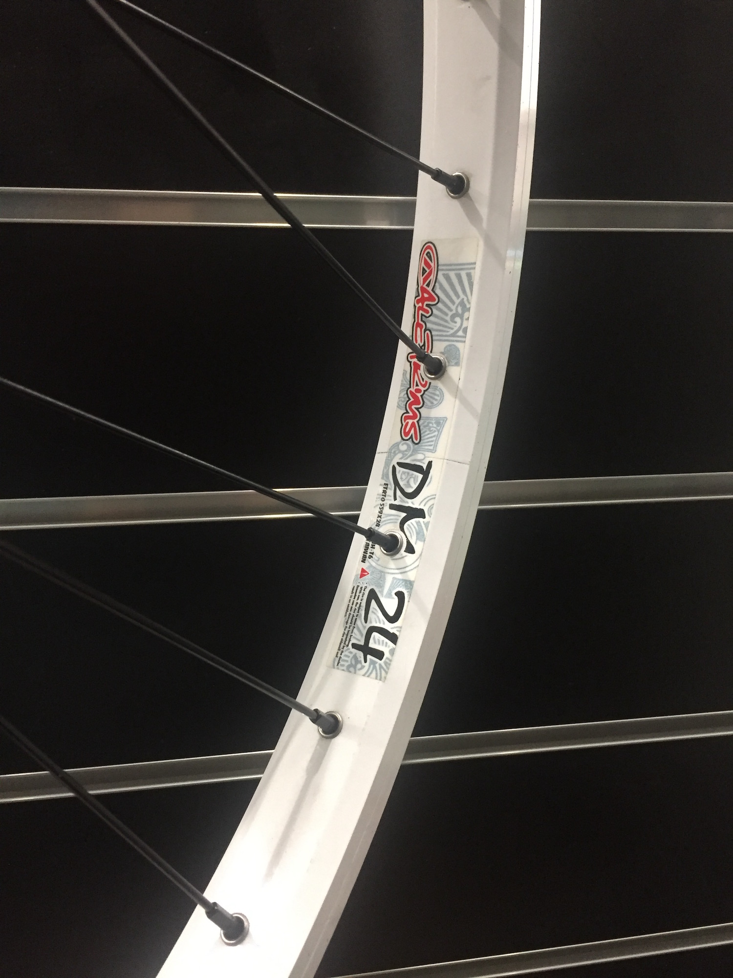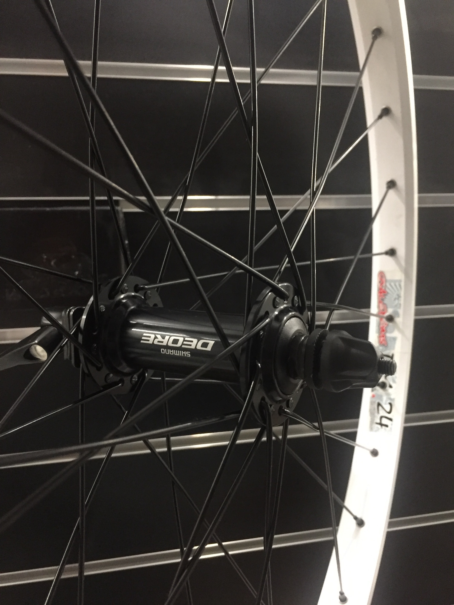 Колесо переднее под V-Brake тормоз. Обод Alexrims DM24, 32H, двойной, пистонированный. Втулка Shimano Deore T610 QR. Спицы и ниппеля Richman. Без ободной ленты. Вес 1170 грамм.