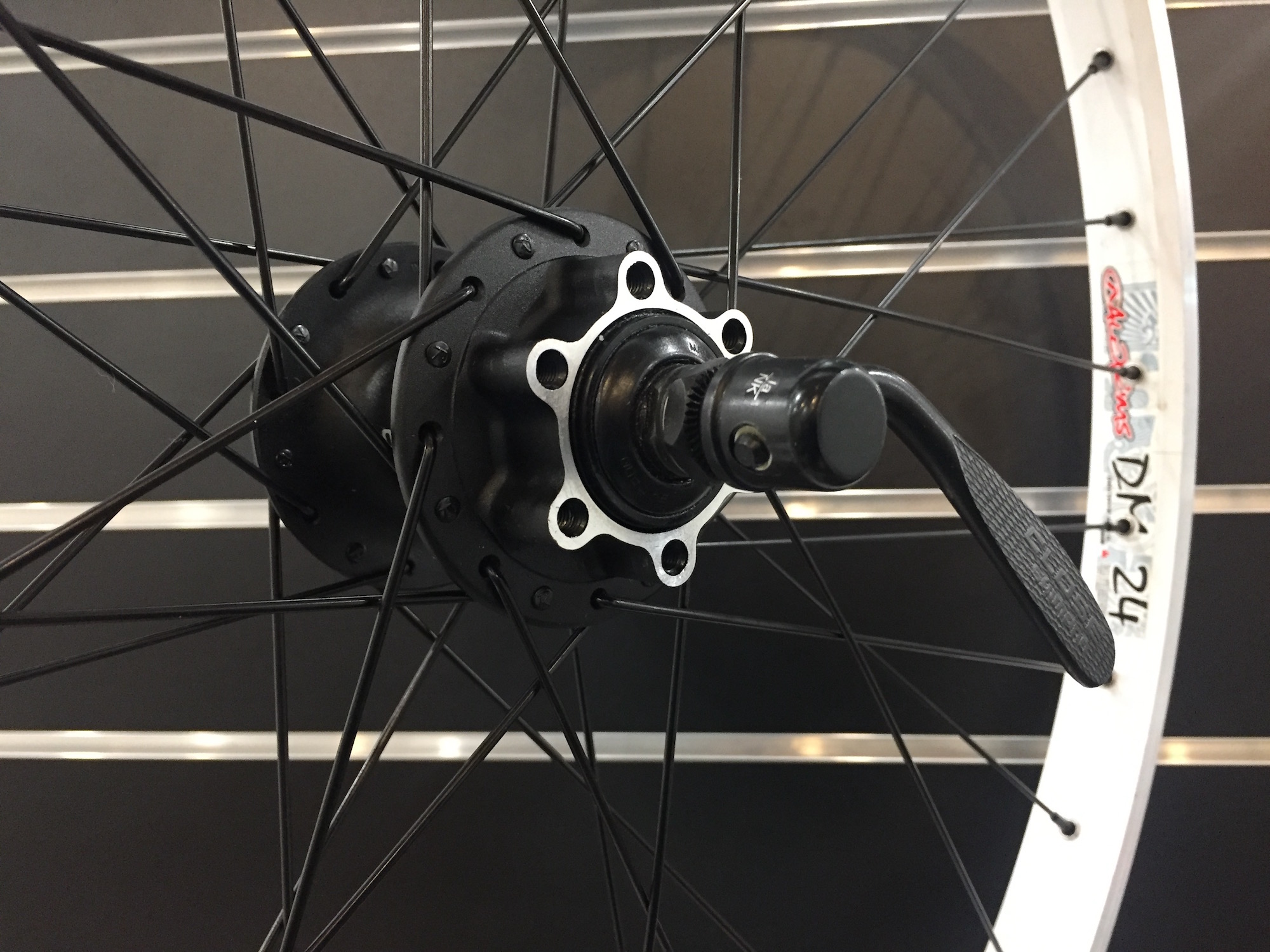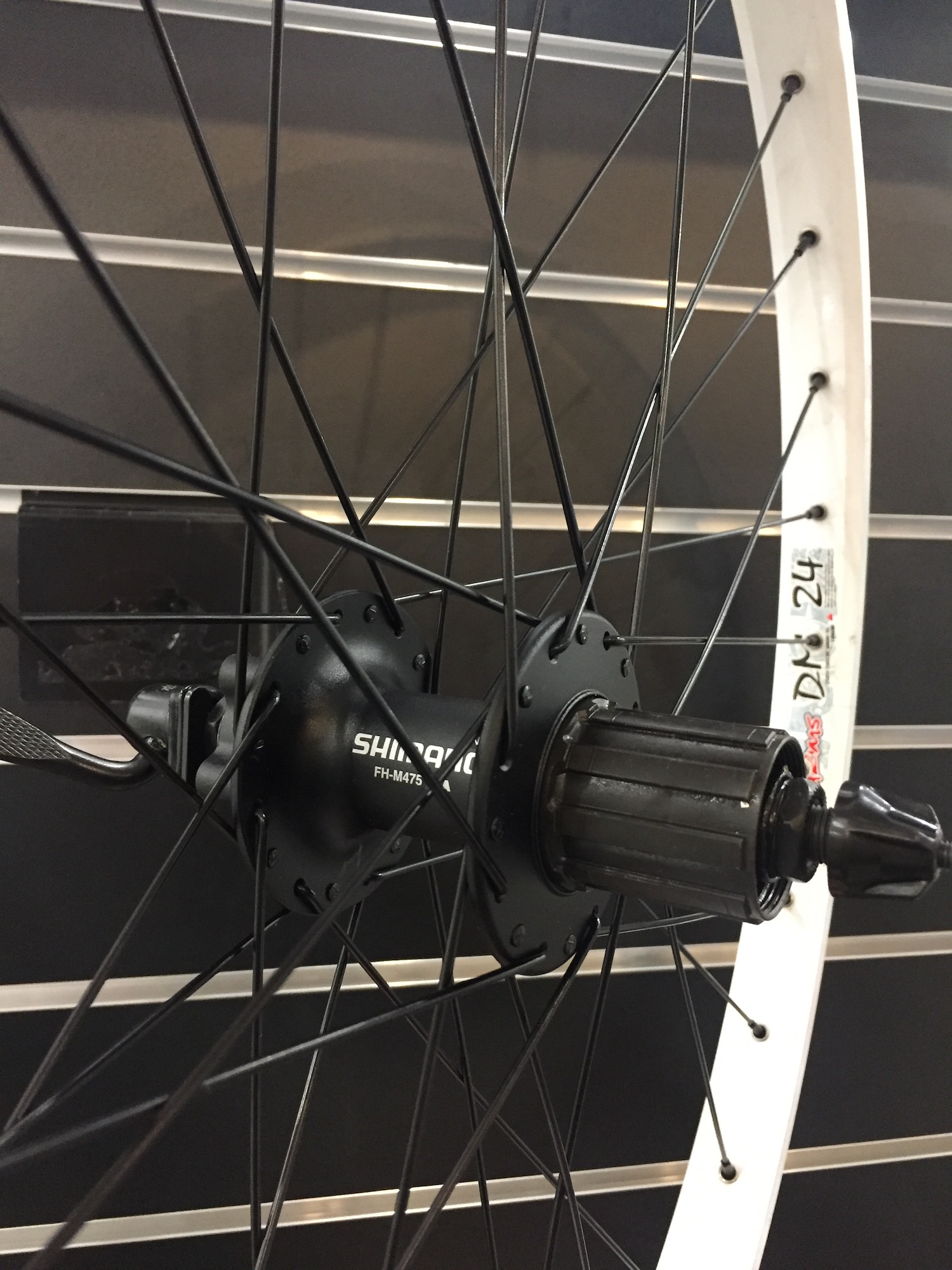 Колесо заднее под дисковый или V-Brake тормоз. Обод Alexrims DM24, 32H, двойной, пистонированный, с тормозной поверхностью под V-Brake. Втулка задняя Shimano FH-M475, под эксцентриу QR, под дисковый тормоз 6 болтов, под кассету 8/9/10 скоростей. Спицы и ниппеля Richman. Вес 1490 грамм (с эксцентриком).