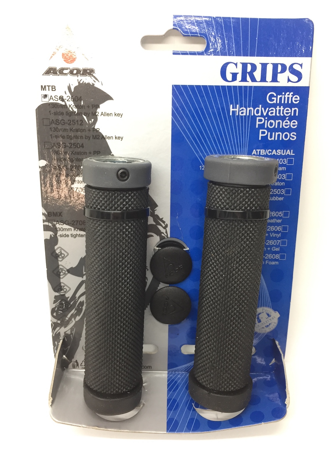 Грипсы велосипедные Acor ASG-2604 ATB Grips, ширина 130 мм, материал Kraton / Gel с односторонней жёсткой фиксацией алюминиевыми кольцами, с заглушками.