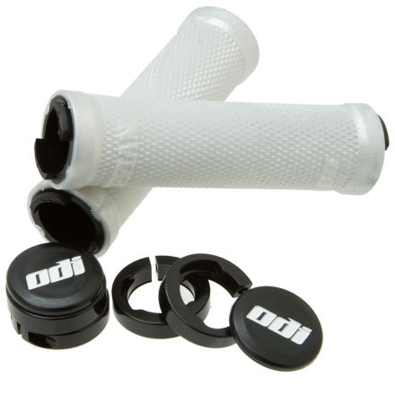 Грипсы ODI Ruffian Limited Edition D30RFS-B, серебряные с черными алюминиевыми грипстопами Lock-On, ширина 130мм, пластиковые заглушки для руля Snap Cap в комплекте, вес 140 грамм