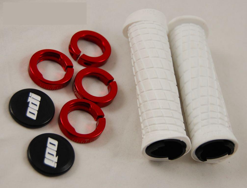 Велосипедные грипсы ODI TROY LEE D30TLW-R, белые с красными алюминиевыми грипстопами Lock-On, ширина 130 мм, пластиковые заглушки в комплекте, вес 98 грамм.