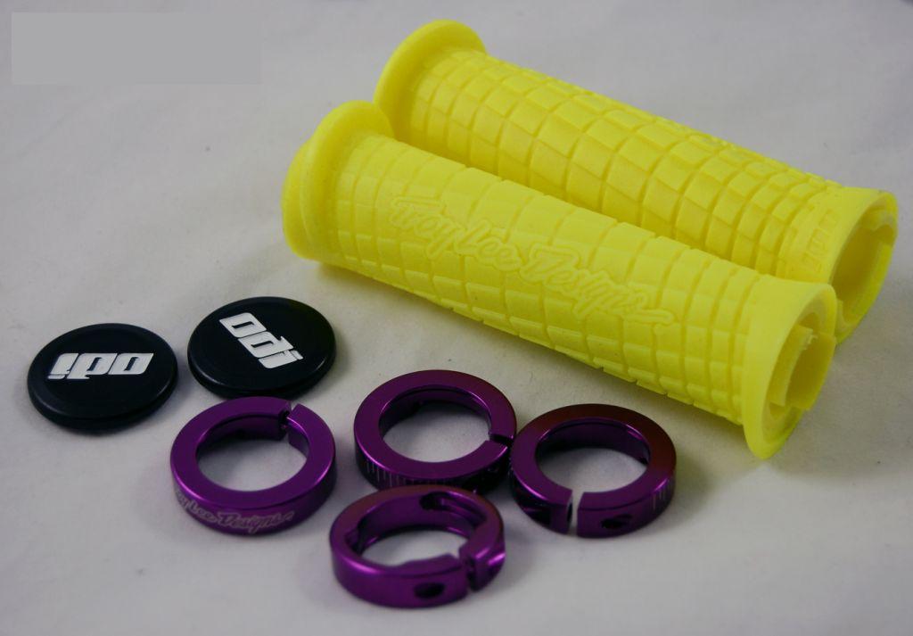 Велосипедные грипсы ODI TROY LEE D30TLY-P, желтые с фиолетовыми алюминиевыми грипстопами Lock-On, ширина 130 мм, пластиковые заглушки в комплекте, вес 98 грамм.