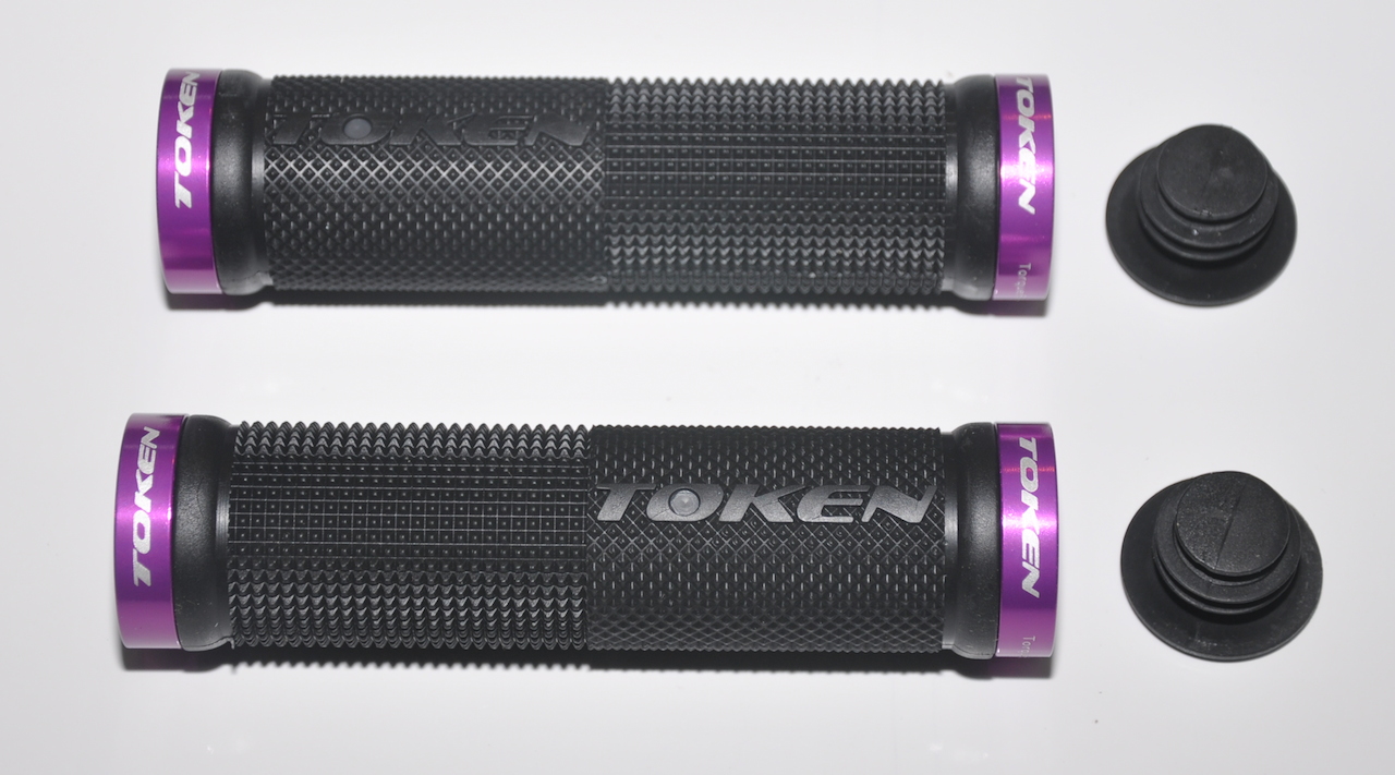 Грипсы Token TK986GA, на жесткой основе, пористый рельеф, ширина 130 мм, система крепления с грипстопами, заглушки для руля в комплекте, цвет черный с фиолетовыми кольцами, вес 120 грамм (пара).