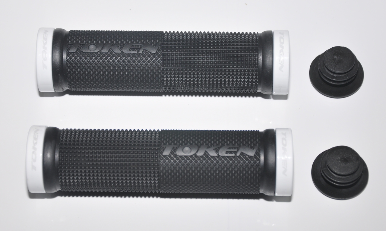 Грипсы Token TK986GA, на жесткой основе, пористый рельеф, ширина 130 мм, система крепления с грипстопами, заглушки для руля в комплекте, цвет черный с белыми кольцами, вес 120 грамм (пара).