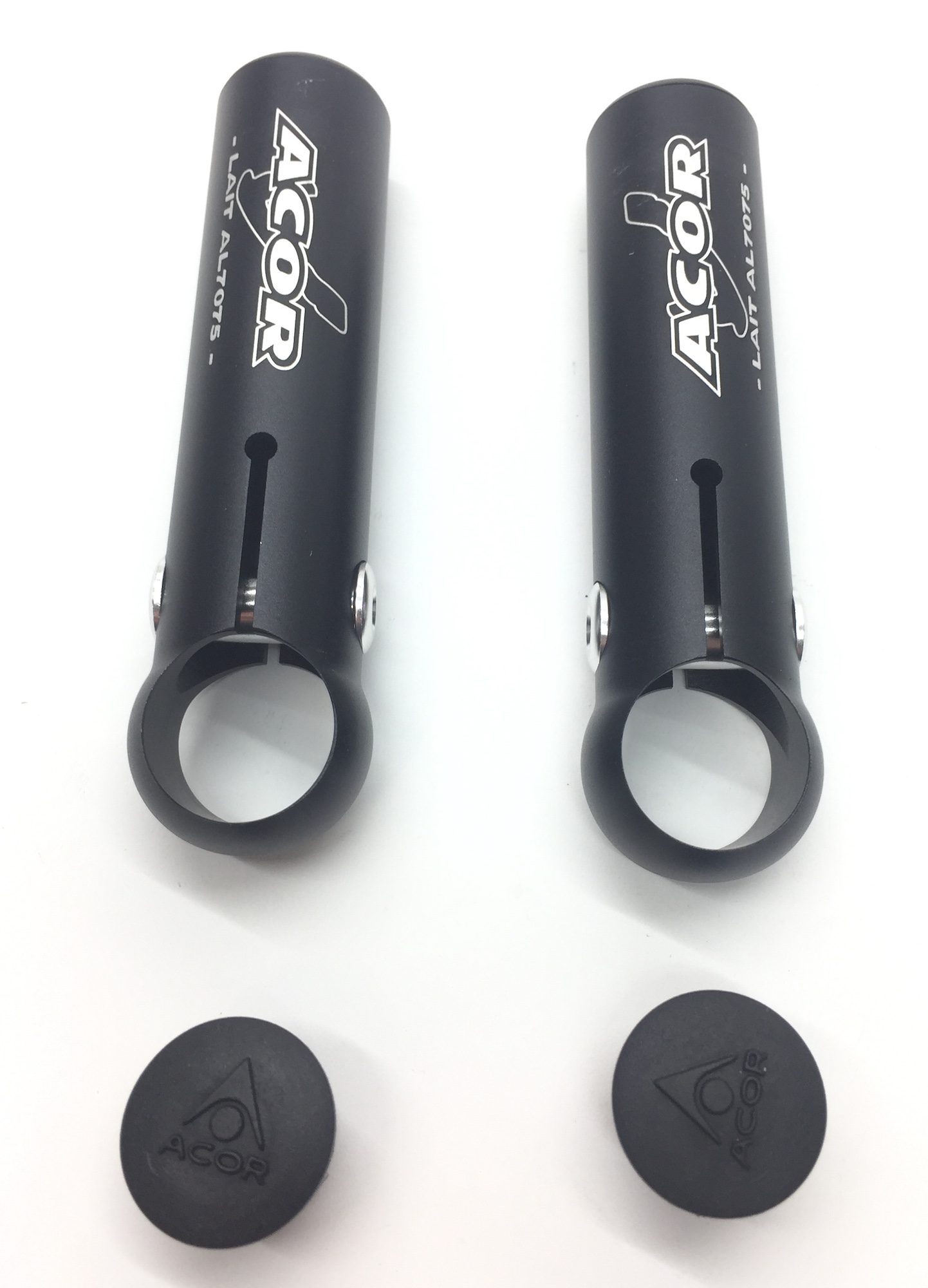 Рога на руль Acor ABZ-2603 AL7 Super Light Barends, материал алюминий 7075, длина 85 мм, диаметр 26 мм, посадка на рули 22.2 мм, с заглушками.