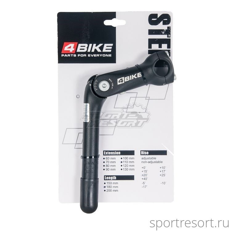 Вынос руля 4BIKE MTS-C331, материал алюминий, длина 110 мм, длина штока 180 мм, регулируемый угол -10°+50°, диаметр штока 25.4 мм (для вилок 1-1/8), диаметр под вынос 31.8 мм.Характеристики