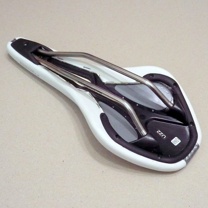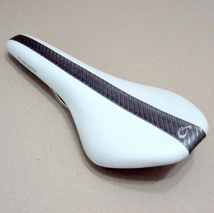 Седло Token Road из натуральной кожи, размер 300 х 135 мм, рельсы из сплава Ti + Alloy, цвет белый, вес 260 грамм.