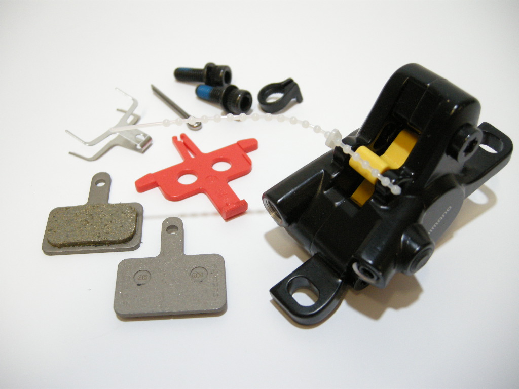 Калипер для гидравлического тормоза Shimano MT400, стандарт крепления post mount, композитные колодки, без адаптера.