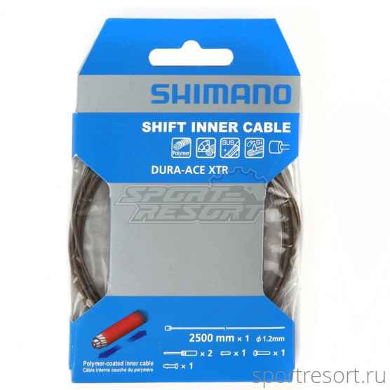 Трос переключения Shimano Polimer Coated Ultimate, серия Ultimate, с полимерным покрытием способствующим лучшему скольжению троса в рубашке, толщина 1.2 мм, длина 2100 мм, в комплекте с концевиками и заглушкой.