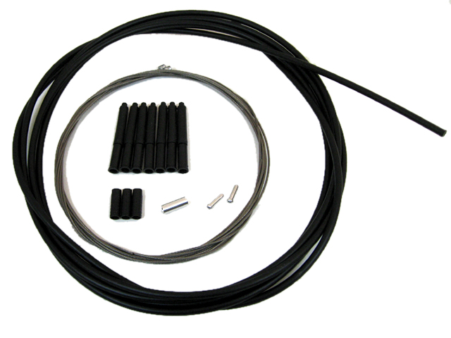 Комплект тросов и оплетки Shimano SP41 MTB, оплетка черная 3000 мм, троса с тефлоновым покрытием 1.2 мм Х 2100 мм / 1.2 мм Х 1800 мм, наконечник троса 9 штук, уплотнитель с резинкой 1 шт, концевик троса 2 шт.