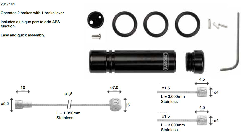 Набор универсальный для тросоразделения: трос, оплетка, набор необходимых фитигов. Благодаря уникальной составляющей позволяет добавить ABS функцию. Материал всех тросов - нержавеющая сталь. Верхний трос: 19 жильный трос из нержавеющей стали, Ø1,5мм. Наконечники: Ø5,5 Х 10 мм и 6ХØ7 мм. Длина 1350 мм. Нижний трос: 19 жильный трос из нержавеющей стали, Ø1,5мм. Наконечник: 4,5ХØ4 мм. Длина 3000 мм.