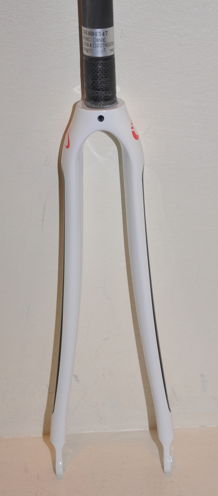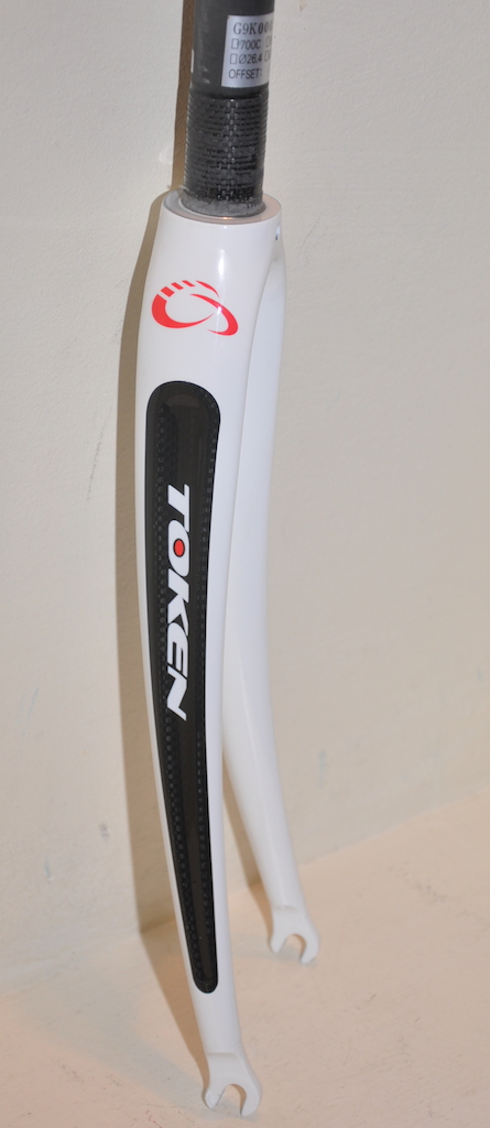 Велосипедная вилка Token Carbon Fiber Road Fork, для велосипедов с колесами 28 дюймов (700C), для шоссе, карбоновый шток 1-1/8", материал перьев MONO-Q 3K Carbon, оффсет 45 мм, 30 мм Crown Race, цвет белый с черной вставкой, вес 380 грамм.