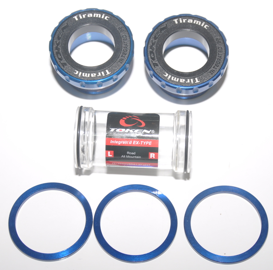 Каретка Token TK877TBT Ceramic, с внешними подшипниками для MTB и Шоссе (универсальный пыльник), под ось 24 мм, размеры 68/73мм, керамические шарики в конусах с титановым покрытием, чашки AL-7075, цвет чашек синий, анодированная покраска, вес 90 грамм!