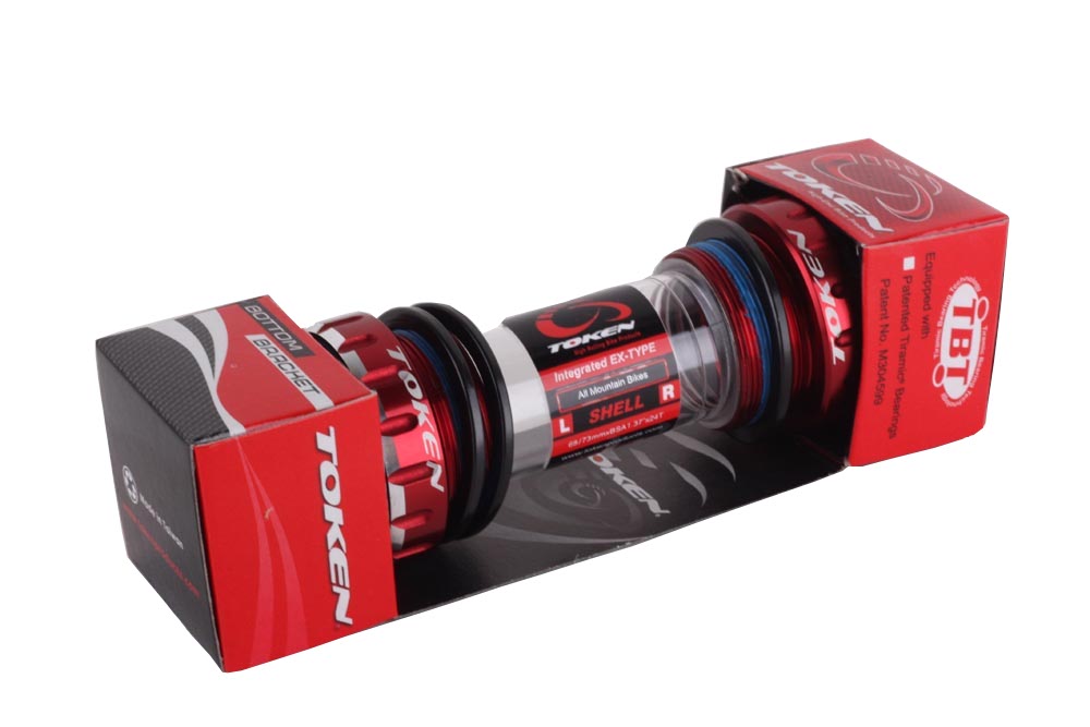 Каретка Token TK887TRB, с внешними закрытыми пром подшипниками, для DJ, FR, DH, для оси 24мм, размеры 68/73мм, чашки AL-7075 красные, вес 127,5 грамм.