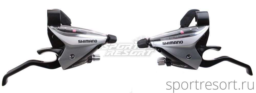 Переключатели скоростей совмещенные с тормозными ручками (моноблок) Shimano ST-EF65, левая и правая сторона, для привода 3x8 скоростей, тормозная ручка под 3 пальца, цвет серебристый, тросы и оплетка в комплекте.