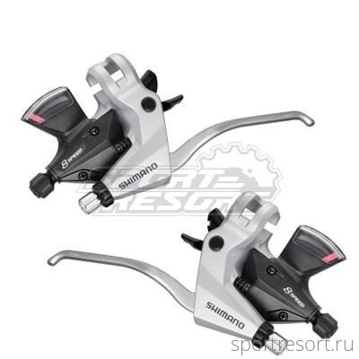 Переключатели скоростей совмещенные с тормозными ручками (моноблок) Shimano ST-M310, левая и правая сторона, для привода 3x8 скоростей, цвет серебро, тормозные ручки под 3 пальца, тросы и оплетка в комплекте.