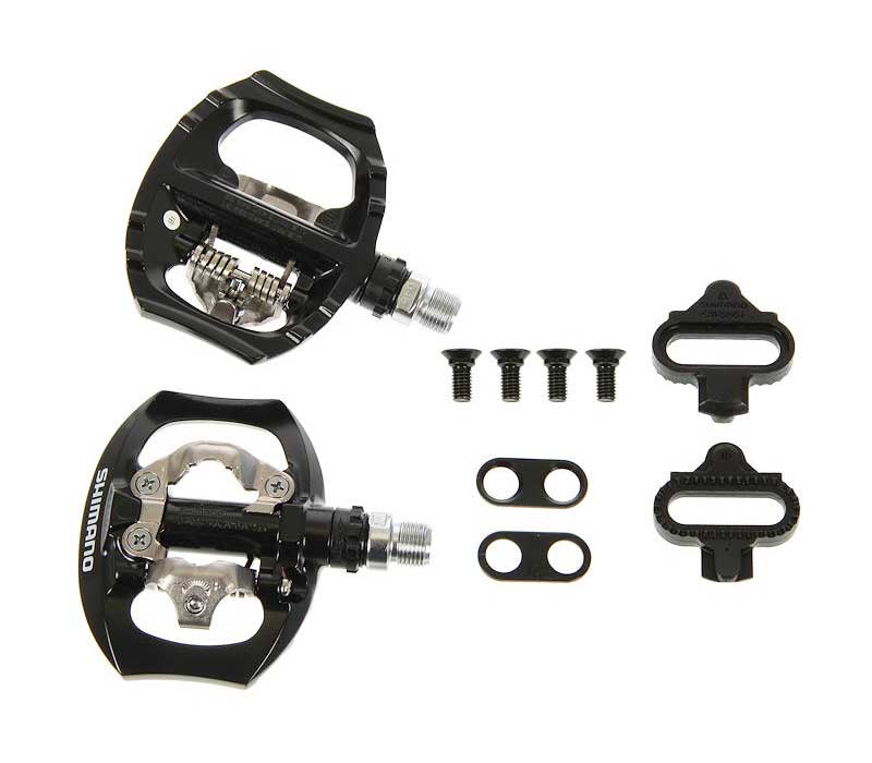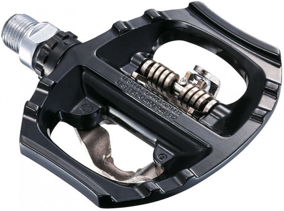Универсальные (двусторонние) контактные педали Shimano PD-A530, стадарт SPD. Двусторонняя платформа позволяет использовать их как с контактными ботинками, так и с обычными.• Эффективное двойное застегивание SPD и вогнутая стабильная платформа