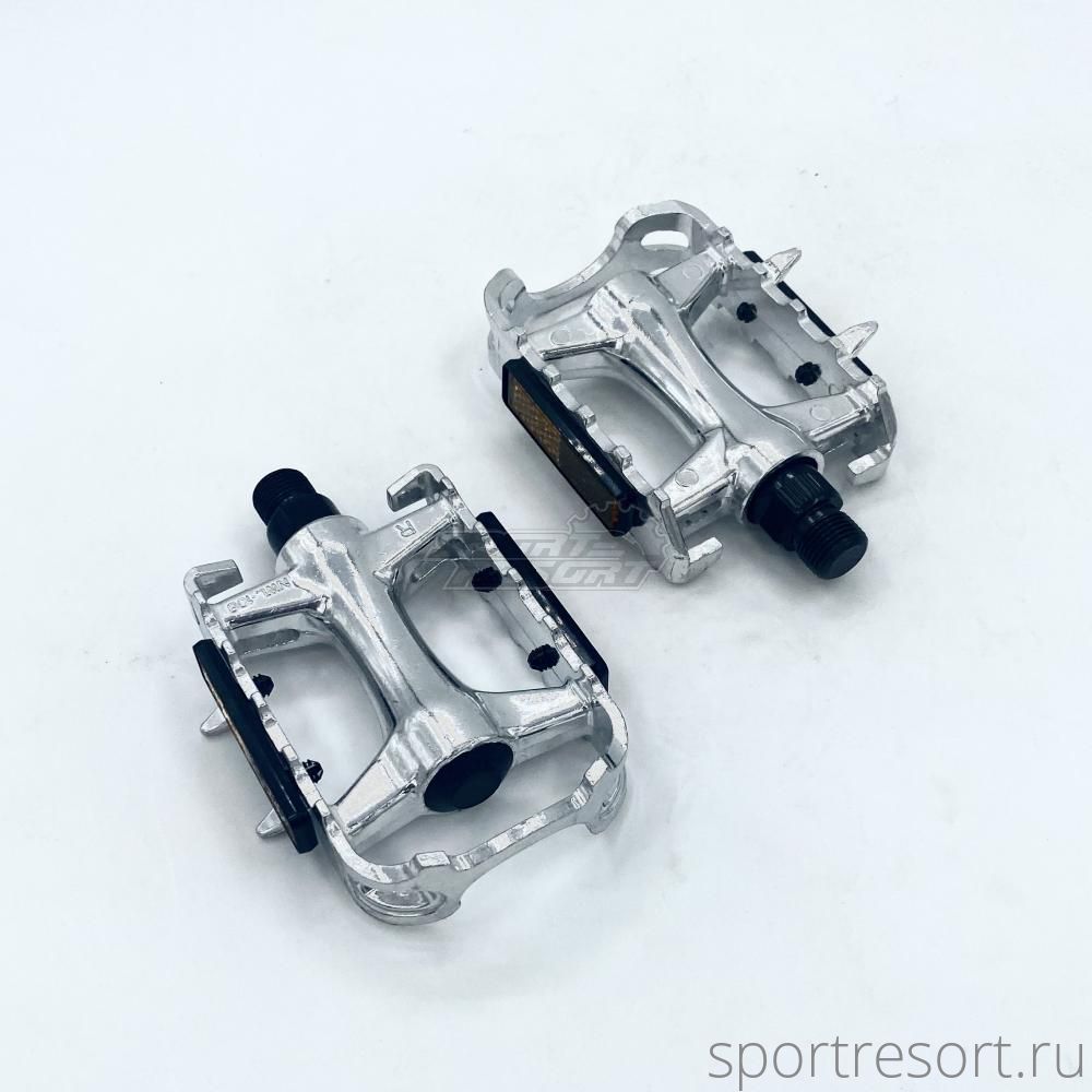 Педали 4BIKE M512, серебро, размер 118х81х24 мм, насыпные подшипники, ось сталь, 2 катафота на каждой педали, вес 406 грамм.