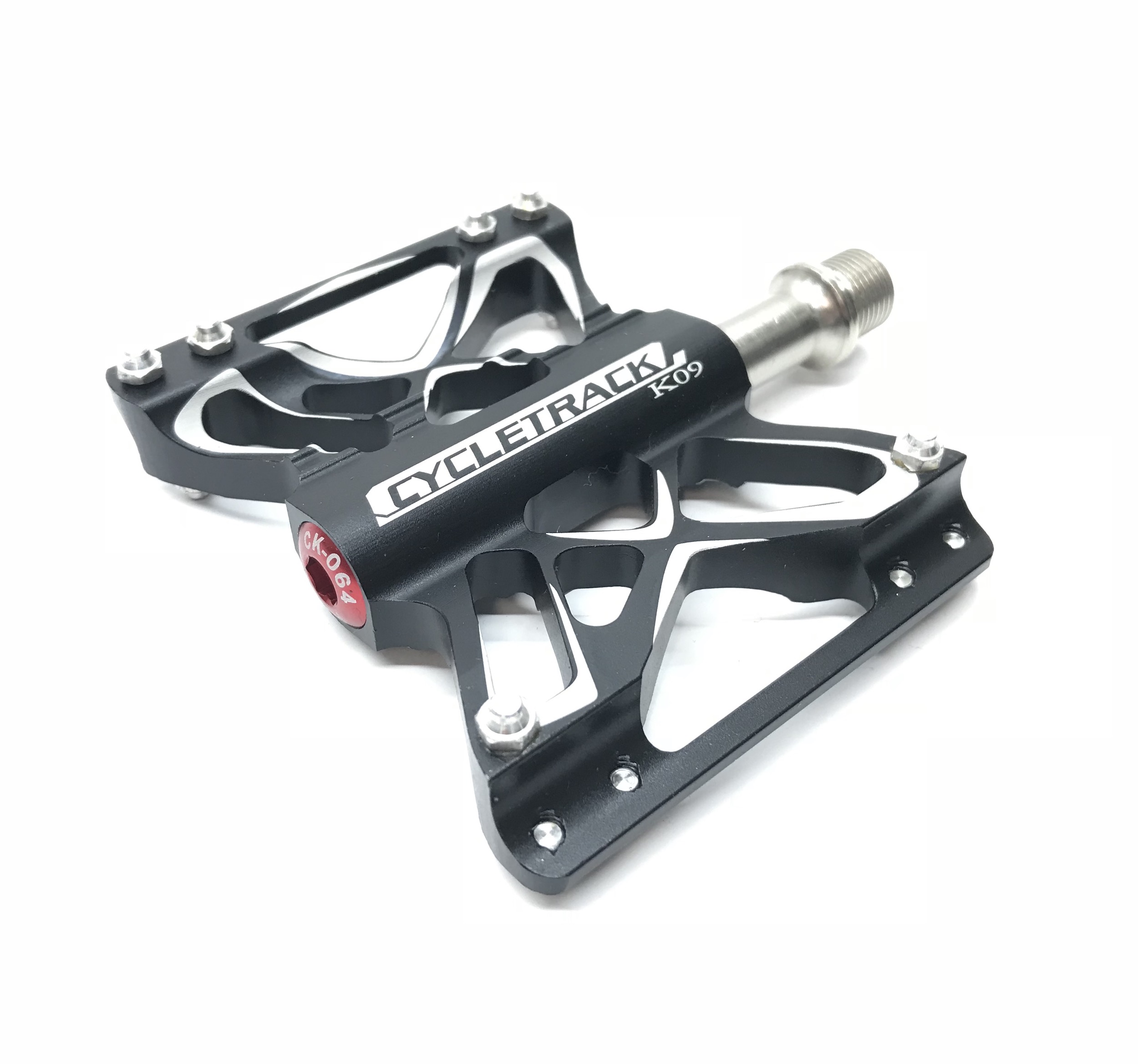 Педали CycleTrack K-09, размер 90х80х13 мм, материал CNC алюминий 6061, ось Cr-mo 9/16, на промышленных подшиниках, сменные шипы, вес 315 грамм (пара). Ограничение по весу 90 кг.
