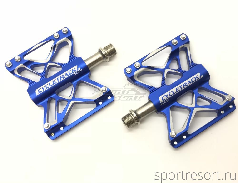 Педали CycleTrack K-09, размер 90х80х13 мм, материал CNC алюминий 6061, ось Cr-mo 9/16, на промышленных подшиниках, сменные шипы, вес 315 грамм (пара). Ограничение по весу 90 кг.