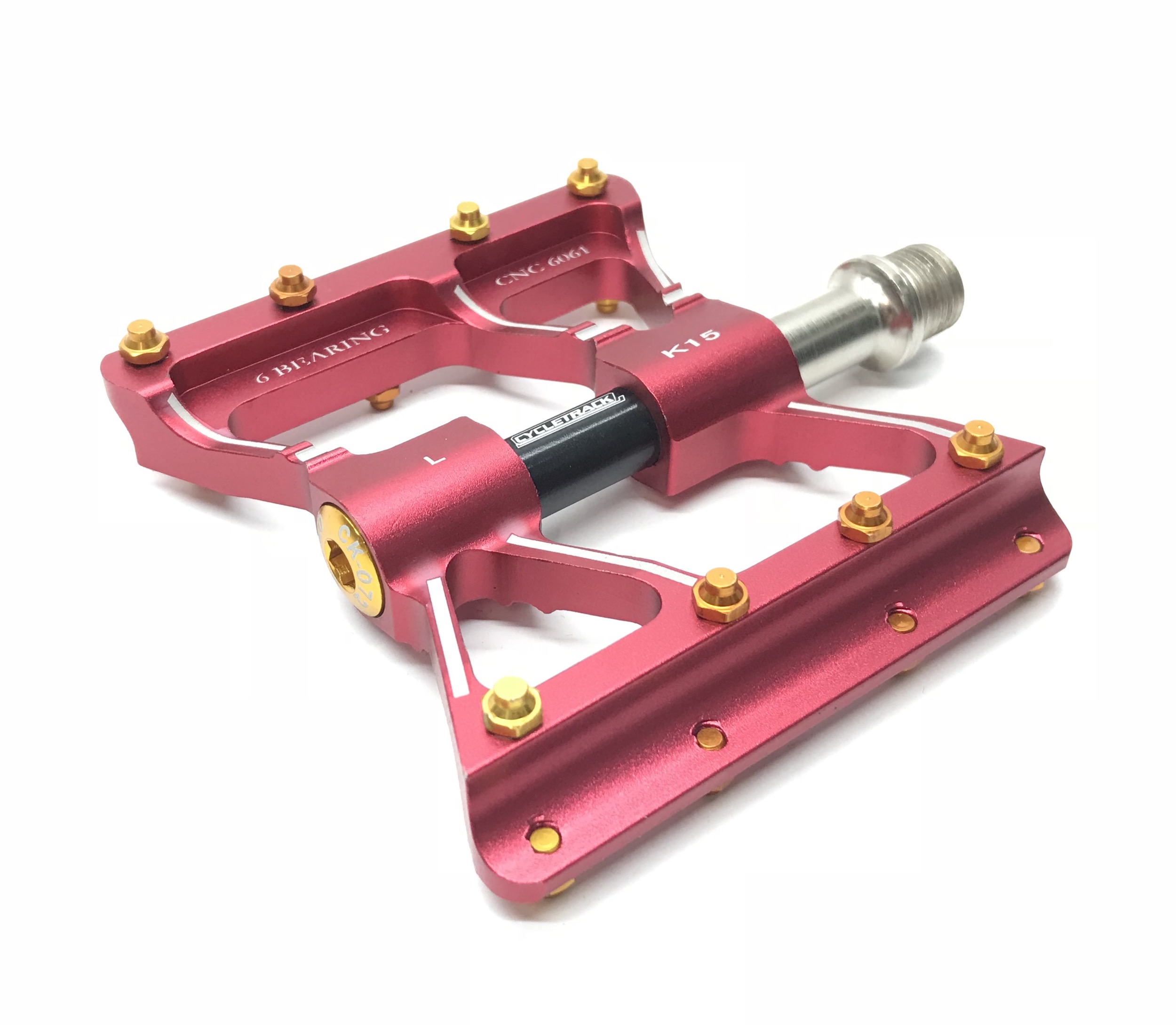 Велосипедные педали CycleTrack K-15, размер 90х88х14 мм, материал CNC алюминий 6061, ось Cr-mo 9/16, на промышленных подшиниках, сменные шипы, вес 295 грамм (пара).В нашем магазине представлен огромный выбор велосипедных педалей, начиная от самых простых и бюджетных моделей в виде стандартных платформ, заканчивая контактными педалями для профессионального велоспорта. Есть модели конкретно для детских велосипедов. Выбрать, и купить педали необходимые вам, вы можете на нашем сайте, или непосредственно в розничном магазине.
