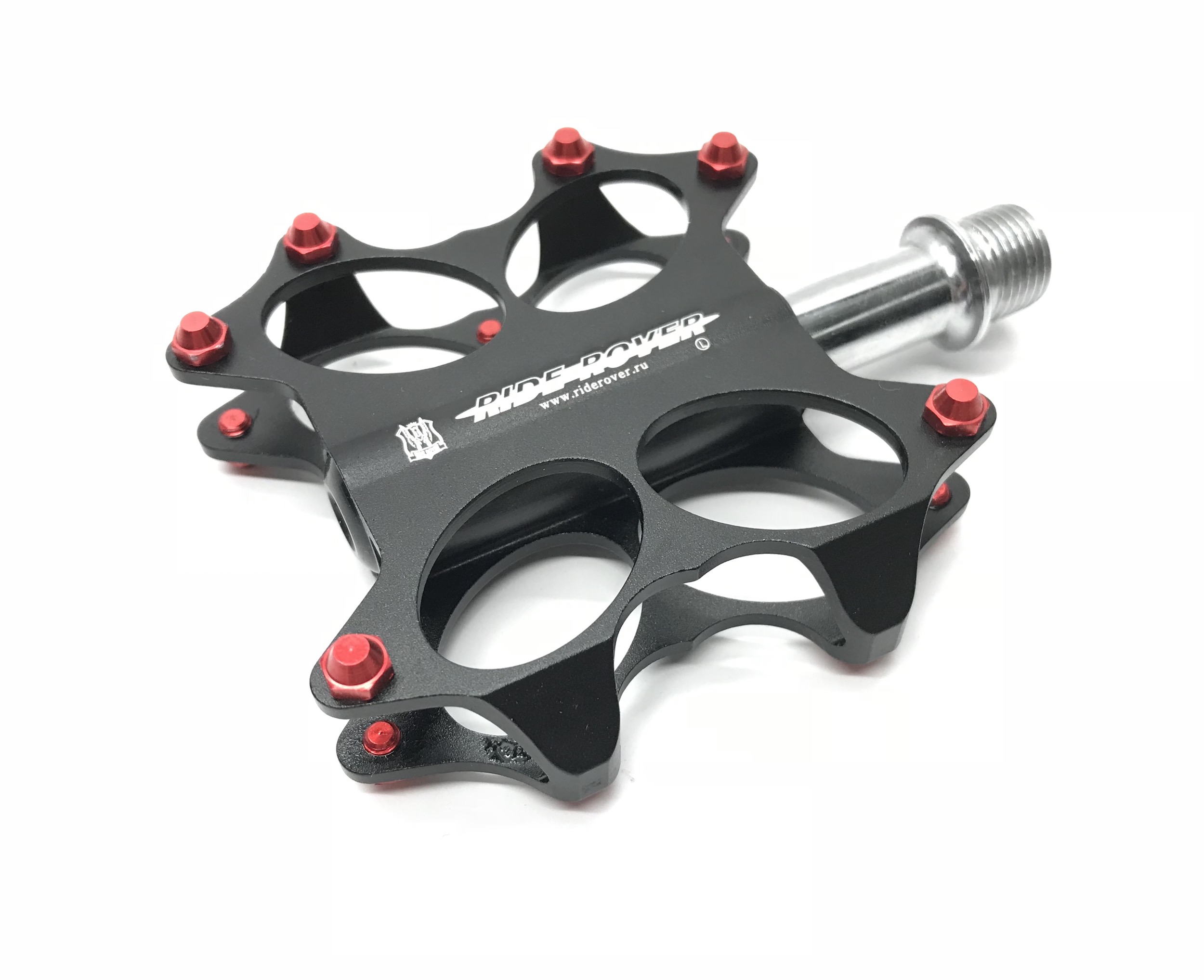 Педали RideRover 07, размер 78х72х16 мм, материал CNC алюминий 6061, ось Cr-mo 9/16, на промышленных подшиниках, сменные шипы, вес 220 грамм (пара). Ограничение по весу 90 кг.