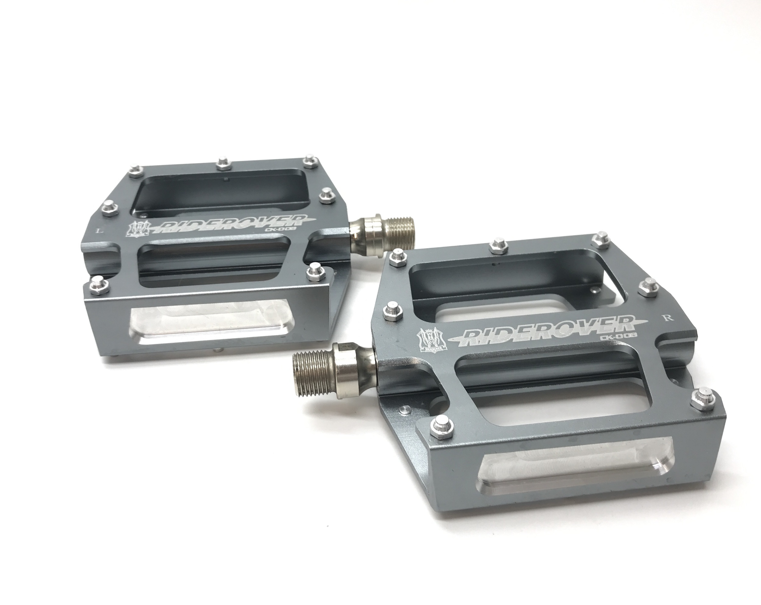 Педали RideRover CK-008, размер 98х90х22 мм, материал CNC алюминий 6061, ось Cr-mo 9/16, на промышленных подшиниках, сменные шипы, вес 385 грамм (пара).