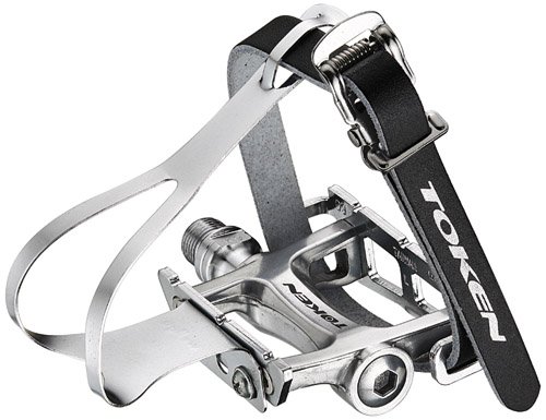 Педали Token TK457TM, платформа из алюминия, полированные, с туклипсами и ремешками, закрытые промышленные подшипники, ось CR-MO, вес комплекта (педали с туклипсами) 370 грамм.