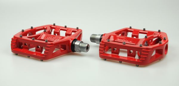 Велосипедные педали Wellgo MG-1, размеры 95х95х20 мм, материал магниевый сплав, промышленные подшипники, ось 9/16 cr-mo, сменные шипы, для ВМХ, триала, вес 376 грамм, цвет красный.