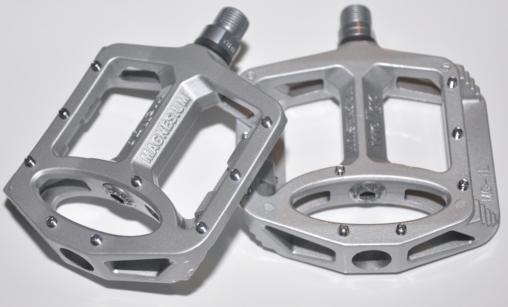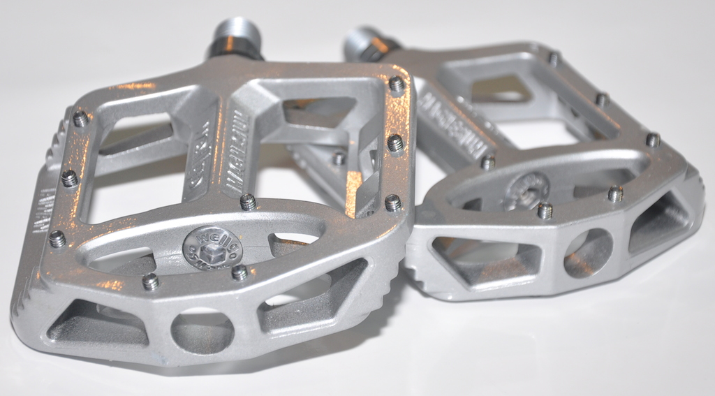 Велосипедные педали Wellgo MG-1, размеры 95х95х20 мм, материал магниевый сплав, промышленные подшипники, ось 9/16 cr-mo, сменные шипы, для ВМХ, триала, вес 376 грамм, цвет серебро.