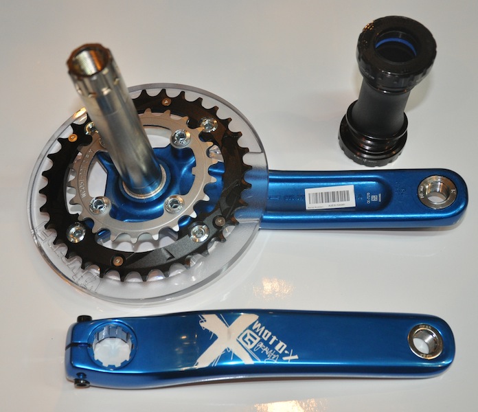 Шатуны FSA MOTO-X, материал алюминий AL6061, совместимы с 9/10 скоростями, очень жесткие, для суровых дисциплин DJ/DH/AM, защитный рокринг из поликарбоната, звезды 32Т из алюминия и 22Т из cr-mo, длина шатунов 175 мм, с кареткой Megaexo 68/73, вес системы в сборе 1230 грамм.