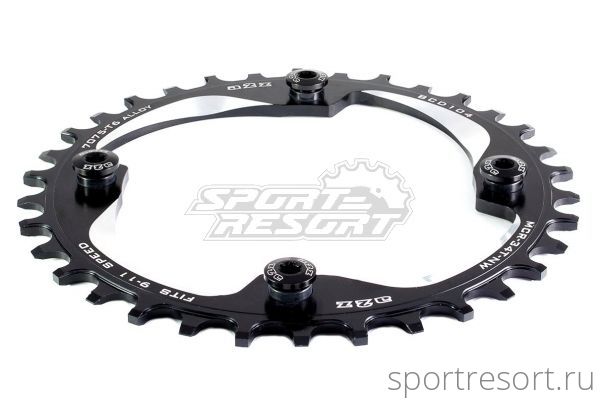 Звезда A2Z, 34T, стандарт крепления BCD 104, технология Narrow-wide (исключает спадание цепи за счет строения зубьев), материал фрезерованный 7075-T6, бонки для крепления в комплект не входят, цвет черный.