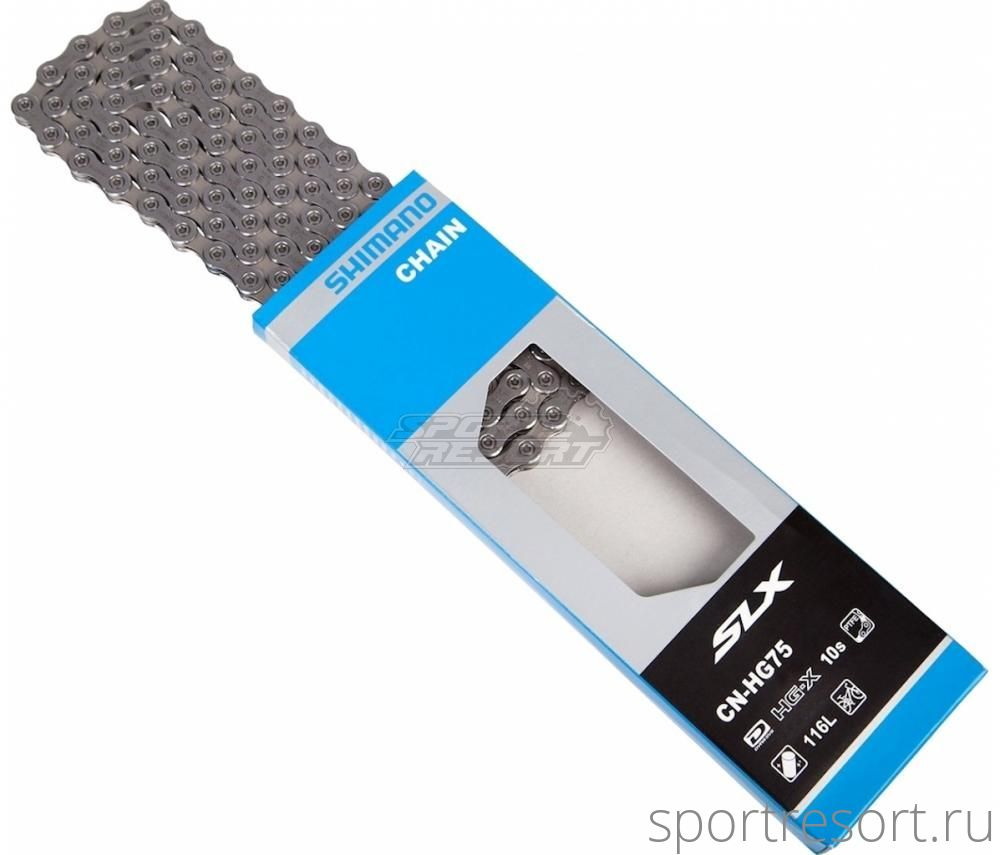 Цепь Shimano CN-HG75, уровень SLX, сверх узкая HG-X, телнология SIL-TEC (специальное покрытие для меньшего износа), для привода 10 скоростей, длина 116 звеньев, ампульный пин, вес 280 грамм.