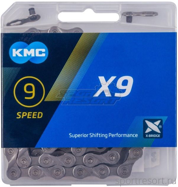 Цепь велосипедная KMC X-9, для привода на 9 скоростей, размер звена 1/2" X 11/128", длина 114 звеньев, толщина пина 6.6 мм, соединительный замок Quick Link в комплекте, вес 280 грамм. Для систем переключения Shimano, Campagnolo, Microshift и SRAM с числом передач 9/18/27.
