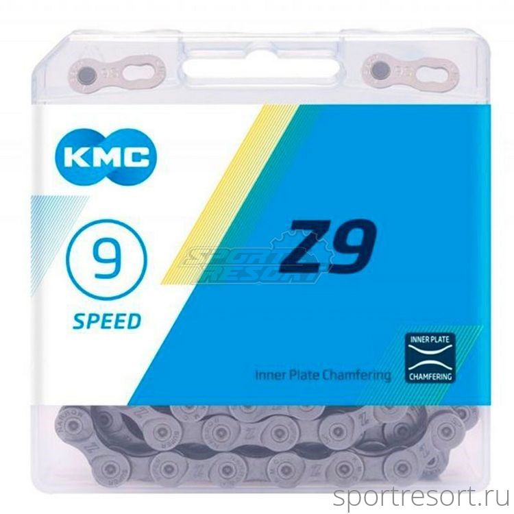 Цепь велосипедная KMC Z-9, для привода на 9 скоростей, размер 1/2" X 11/128", длина 116 звеньев, соединительный замок Quick Link в комплекте, вес 310 грамм. Серая